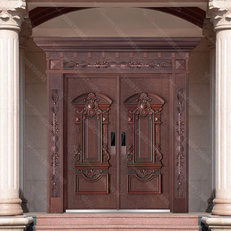 Данная входная дверь для виллы, выполненная в основательном и величественном стиле медного литья, сочетается с изысканной резьбой. Ее общий облик элегантен и благороден, символизируя премиальность и солидность. Поверхность двери прошла многоуровневую антиоксидантную и антикоррозийную обработку, что позволяет ей сохранять блеск и текстуру даже после длительного использования, не опасаясь воздействия ветра и дождя. Это не просто дверь, а визитная карточка, демонстрирующая статус и вкус владельца, которая с первого взгляда позволяет ощутить мощь и масштаб виллы.